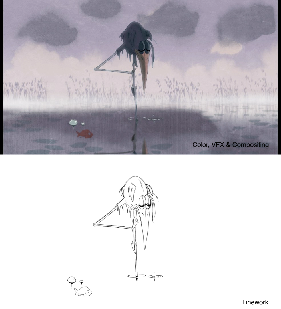As one of three compositors/VFX artists, I was given the linework and an ink & paint pass, along with styleframes from the show art director, and tasked with turning the animation into the final look of the short.